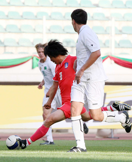 金斗が前半14分、右足の強烈なミドルシュートで先制ゴールを決めた。トルクメニスタンはこの失点以後、ロングパスを中心にカウンターねらいに転換したが、前半を1-0で折り返した。
