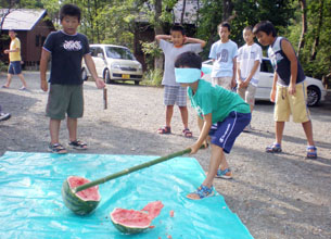 民団滋賀本部(具滋源団長)は28日まで1泊2日の日程を組み、オリニ18人を滋賀県高島市の朽木思い出の森に招いた。バンガローでは全員でスイカ割りを楽しんだ。2日目には民族文化などについて学習した。