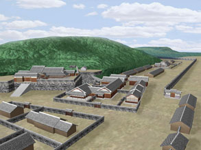 [ 東館CG 東館は経済活動の場である。倭館最高責任者の「館守屋」、貿易のための「開市大庁(トレードセンター)」などが置かれていた。東館の建築は典型的な日本の武家屋敷だが、その屋根は朝鮮大工が自国の工法で建設している。向こうに見える龍頭山には現在、釜山タワーがある ]