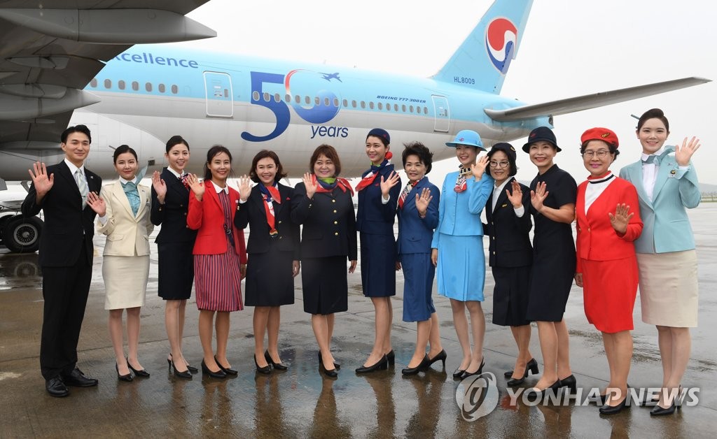 大韓航空は2日、創立50周年を迎え、現役の客室乗務員と元客室乗務員が歴代の制服を着て仁川国際空港で記念撮影を行った。
