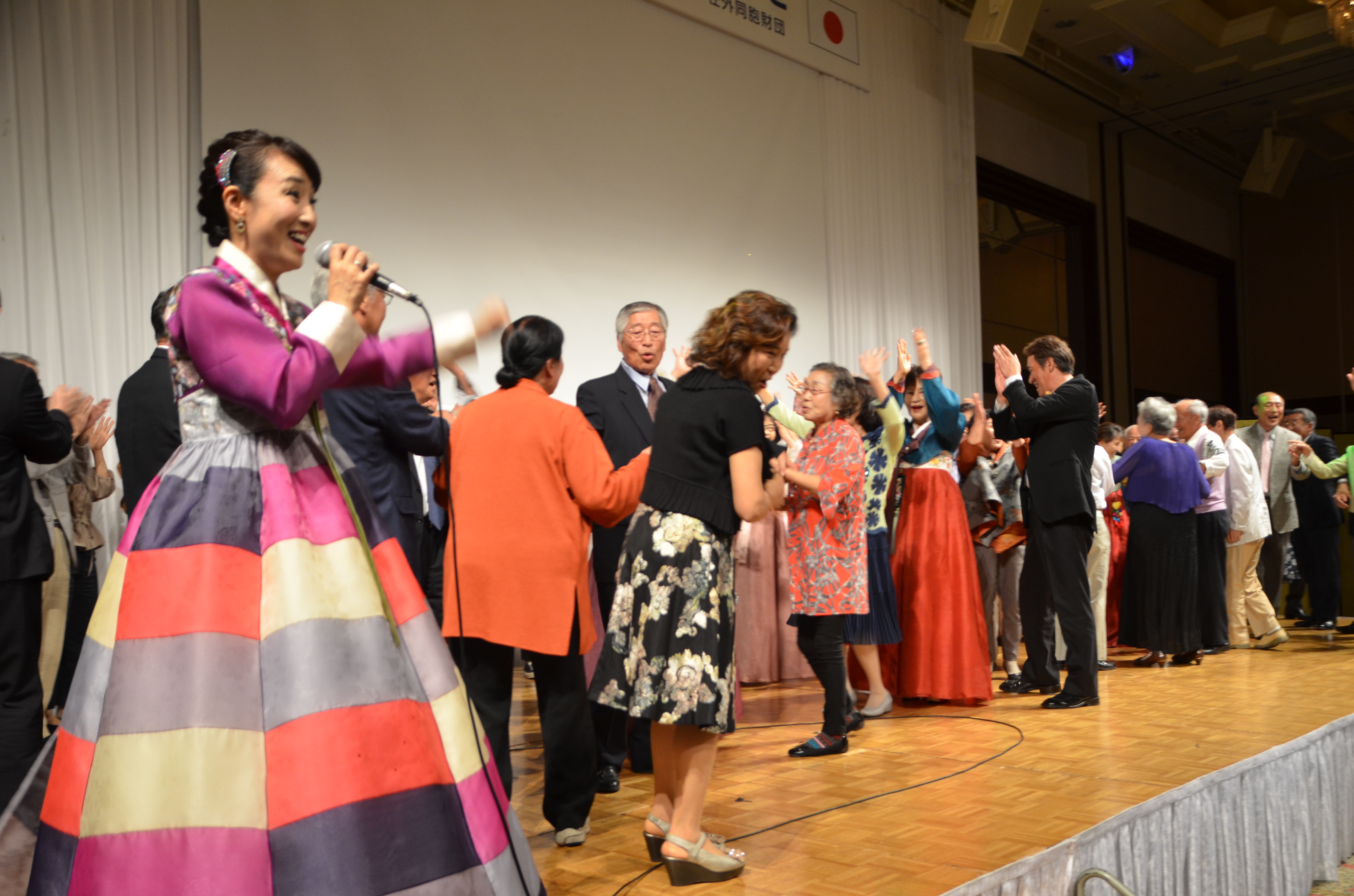 [ 韓国歌謡に合わせて舞台で踊り出す参加者 ]