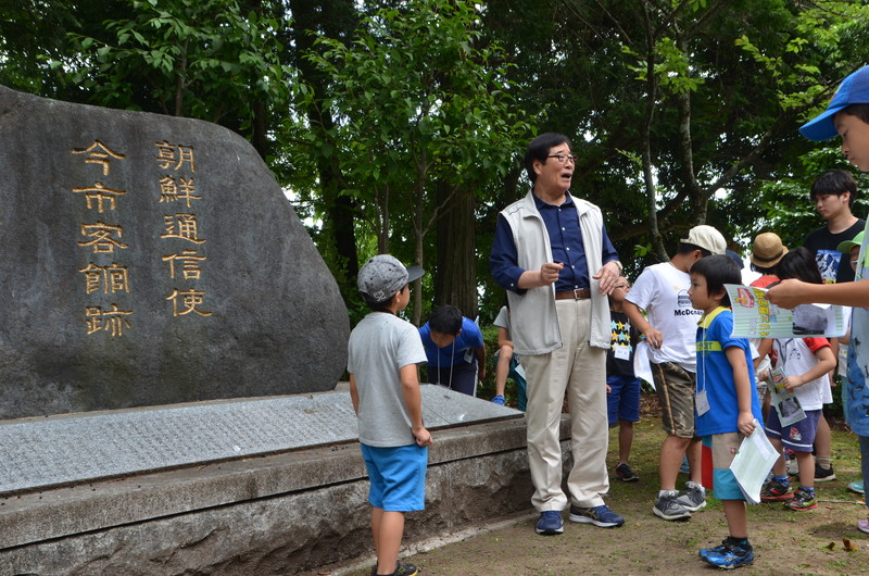オリニは真っ先に碑に駆け寄ると、「これなんて書いてあるの?」と興味津々の様子で案内役の青年会役員に説明を求めていた。引率した民団埼玉本部の景民杓常任顧問が、当時の先進的な文化を伝えた朝鮮通信使の役割について解説した。オリニは持参のしおりを取り出すと、自発的に碑の形をスケッチしたり、題字を書き写していた。