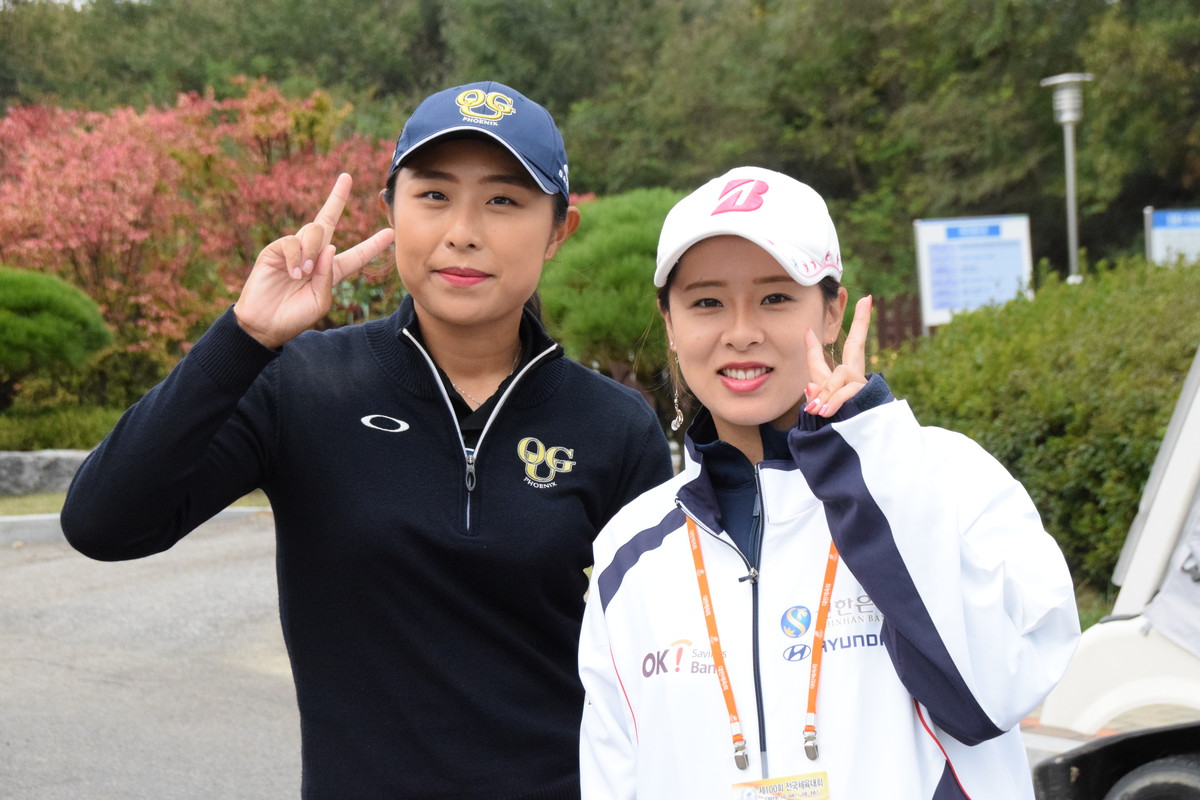 [ 最終日のゴルフ女子団体戦で金メダルを獲得した姜美咲、姜智賢組 ]
