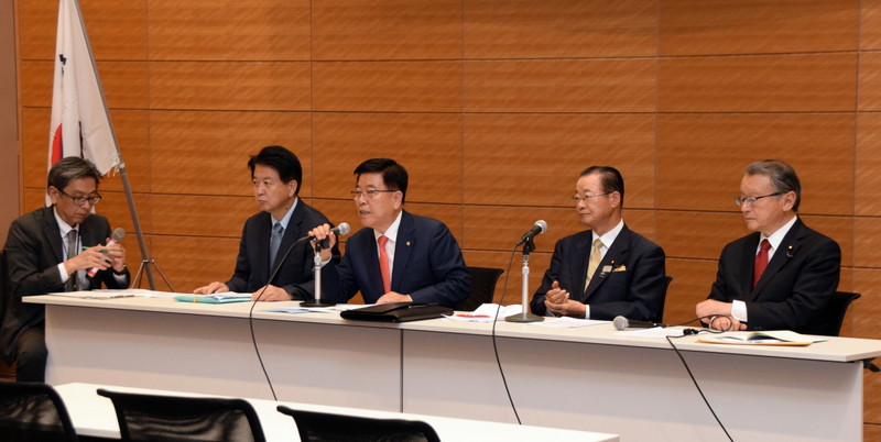 [ 総会終了後、記者会見する両国議員連盟幹事長(左から3人目が金光琳韓日議連幹事長、4人目が河村建夫日韓議連幹事長) ]