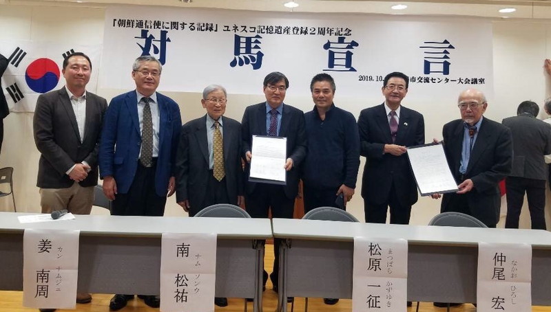 【長崎】「朝鮮通信使に関する記録」が「ユネスコ世界の記憶」(世界記憶遺産)に登録されて2年となる10月30日、登録を推進してきた韓日の主要メンバー4人が対馬市で善隣友好を呼び掛ける「対馬宣言」を発表した。