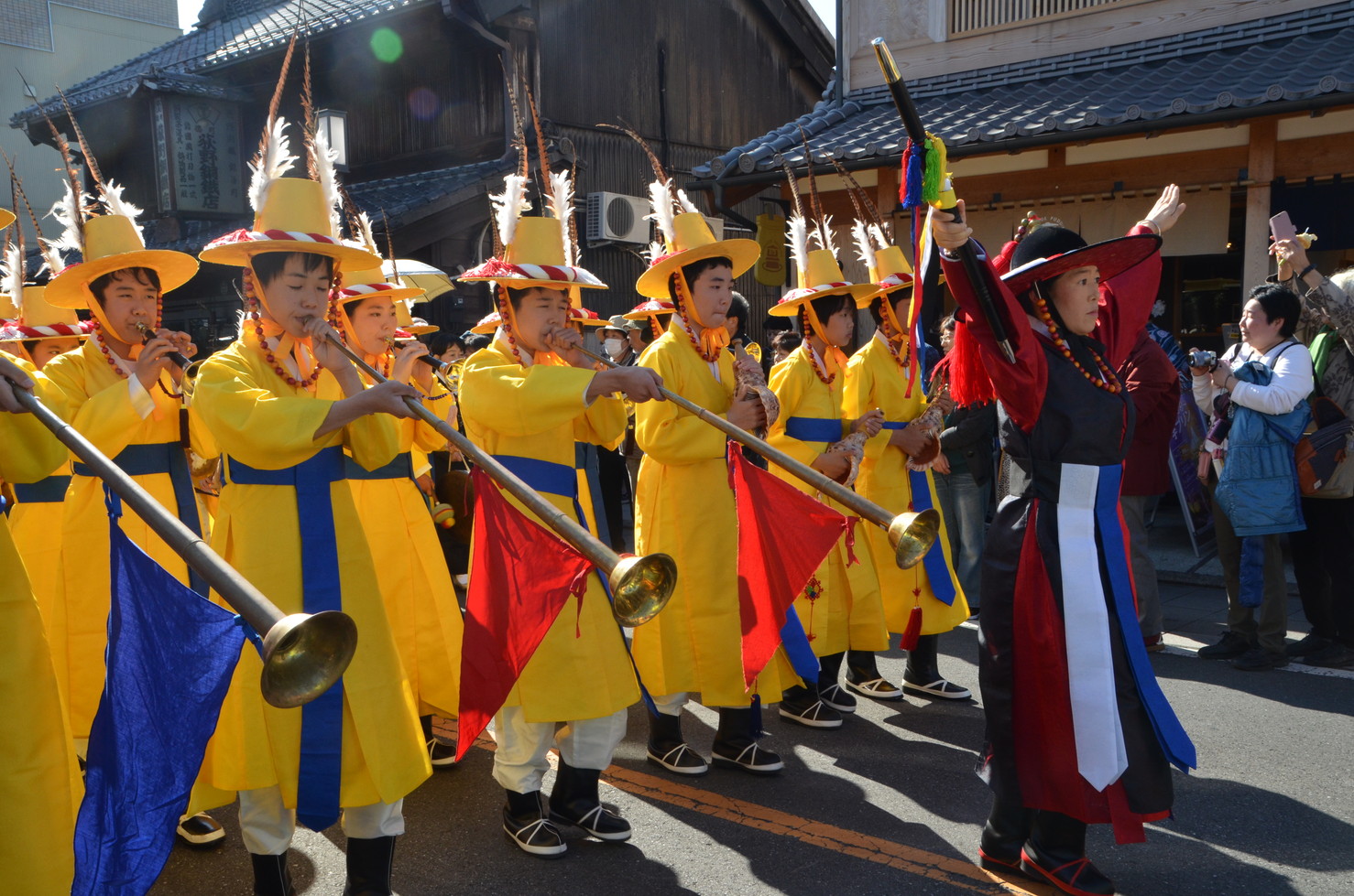 けやき学園の子どもたち60人が楽隊を組んで一行を先導。特別参加の釜山芸術団の吹打隊が整然とした隊列を組んで続いた。正使は釜山文化財団の姜東秀代表理事、副使は第12回正使(1811年)を務めた金履喬の子孫にあたる金玄鎮氏がそれぞれ扮した。この後を「従事官」「上官」「女官」などが続いた。
