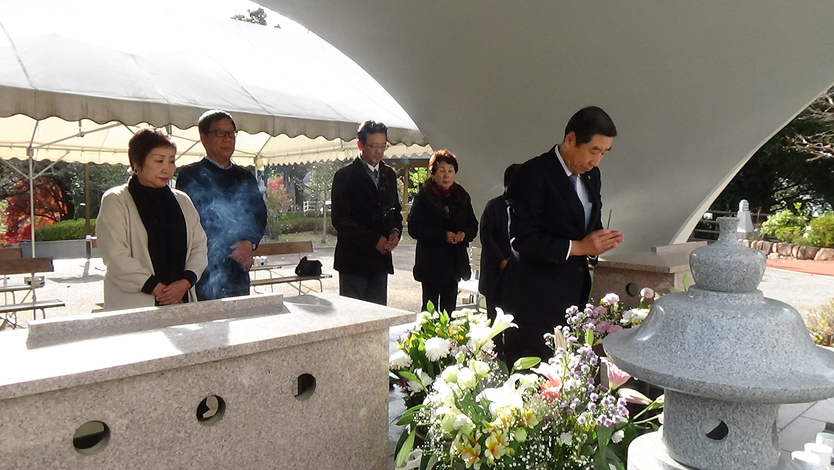 [ 納骨堂で献花・焼香を行う民団関係者ら ]