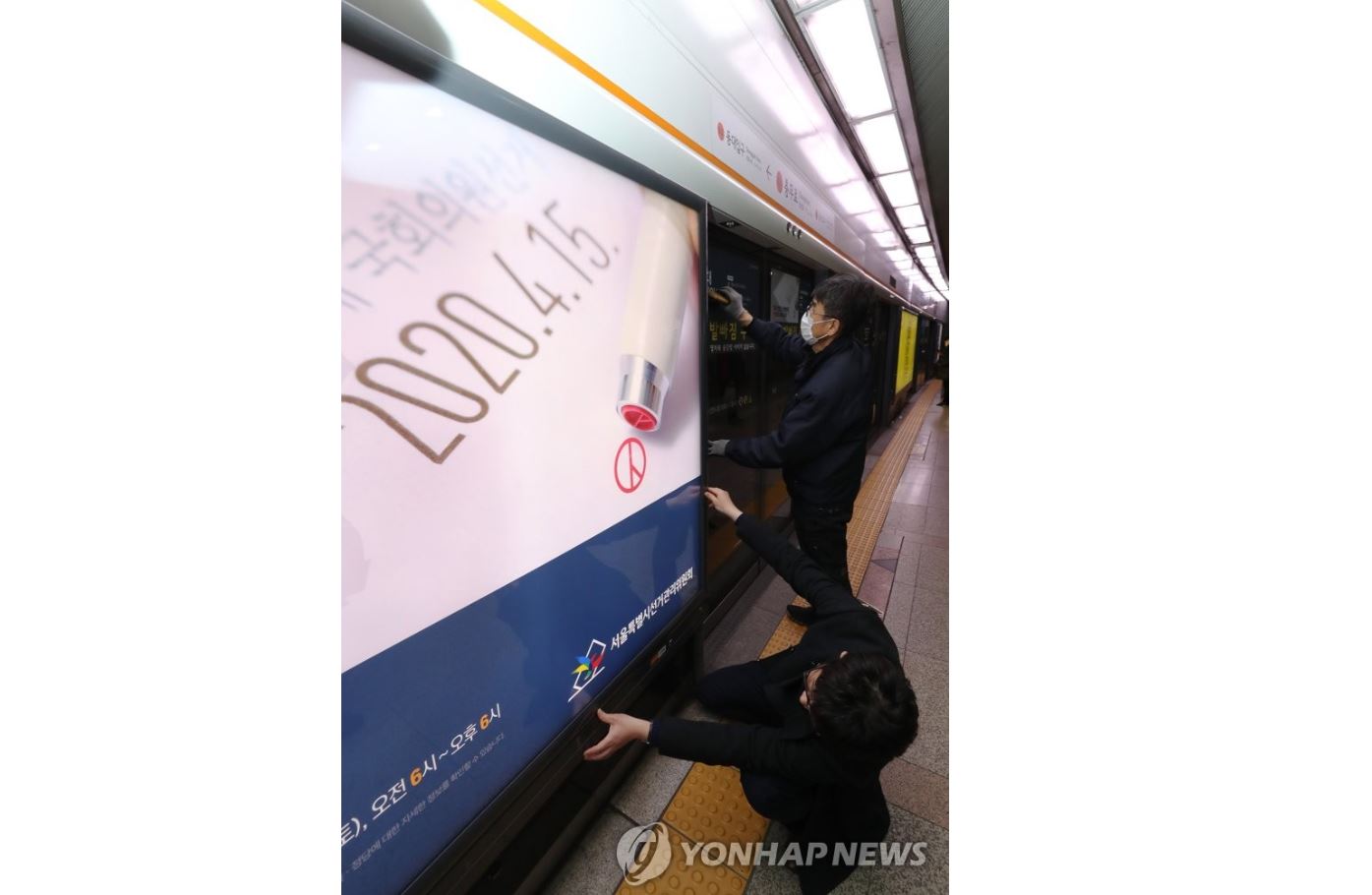 [ 韓国の総選挙(4月15日投開票)が約1カ月後に近づく中、ソウルの地下鉄の駅に投票を呼び掛ける看板が設置された=13日、ソウル ]