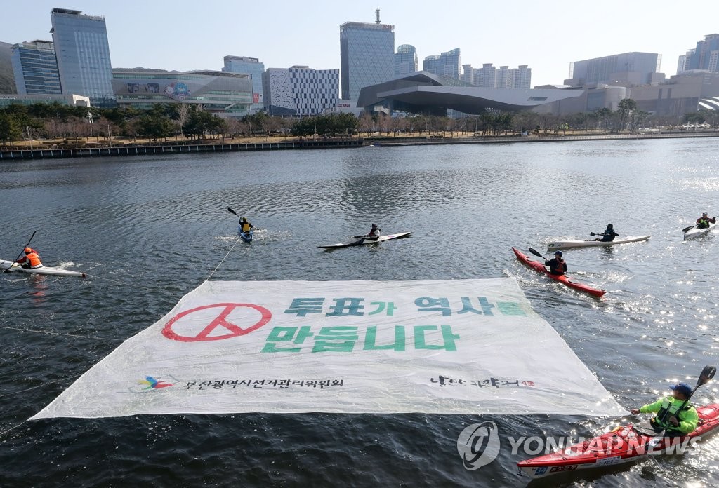 [ 釜山市海雲台区の河川で、カヤック同好会のメンバーと市の選挙管理委員会が投票を呼び掛けるパフォーマンスを行った=15日、釜山 ]