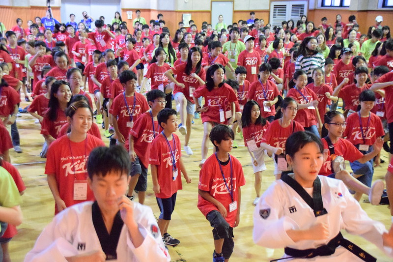 [ 韓国の小学校体験入学では、韓国の国技、テコンドの体験も(2018年) ]