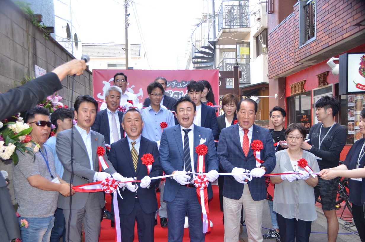 オープニング式典には韓国で「ホンチュンチョン」を170店舗展開するチキン専門店「フララ」から金秉甲会長、駐日韓国大使館から鄭成昌特許参事官がお祝いに駆けつけ、店主の鄭宰旭さん(新宿韓国商人連合会事務局長)を激励した。