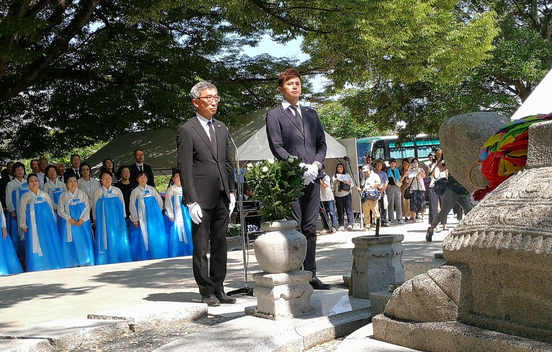 民団中央本部の呂健二団長や駐広島韓国総領事館の金宣杓総領事、中国地協の団長ら約300人が参列した。