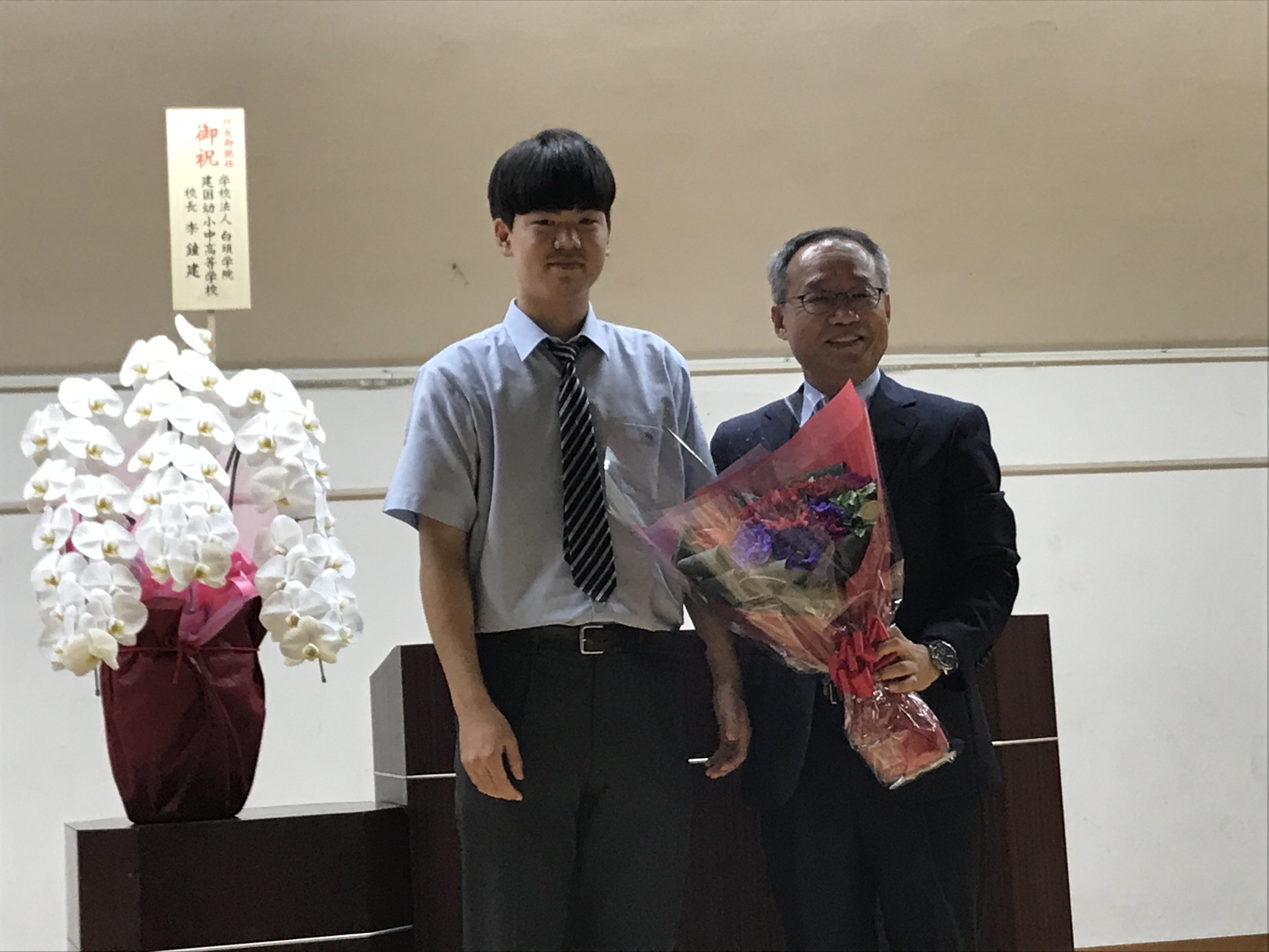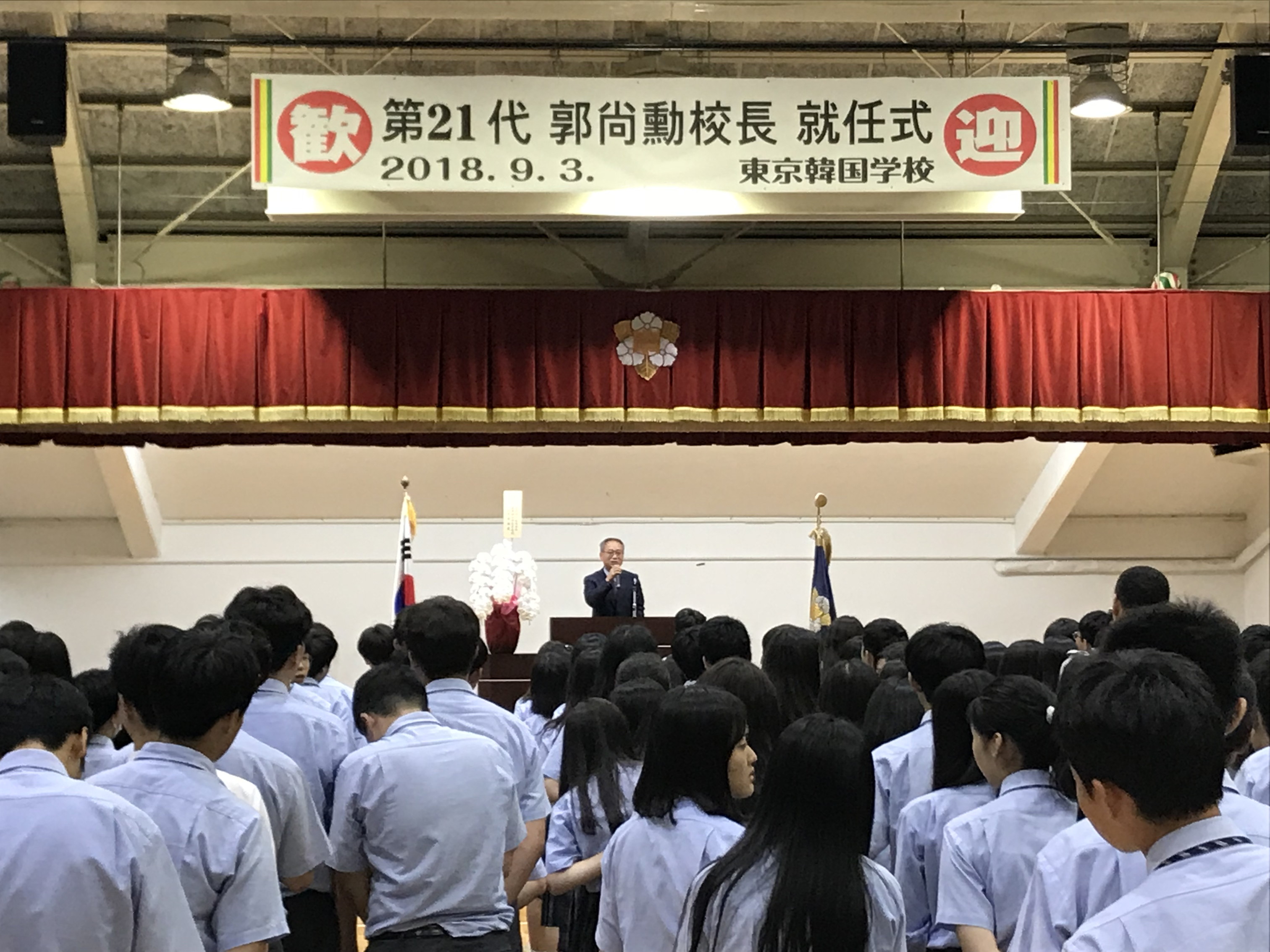 東京韓国学校に3日、郭尚勲新校長が就任。歓迎式典で花束を贈られた。