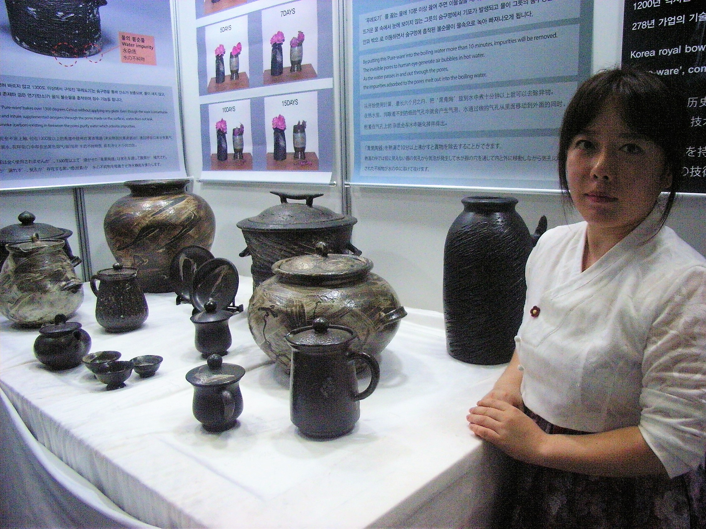 韓美要裵氏土家の「青黒陶器」は美しいだけでなく、浄水機能を併せ持つ逸品だ。目に見えない気孔が酸素を取り込むほか、器に浸透した炭素の力で水に含まれる不純物を吸着させる。水を入れておく時間が長くなるほど味がよくなるという。器にさした生花も長持ちし生鮮食品の保存に適しているようだ。