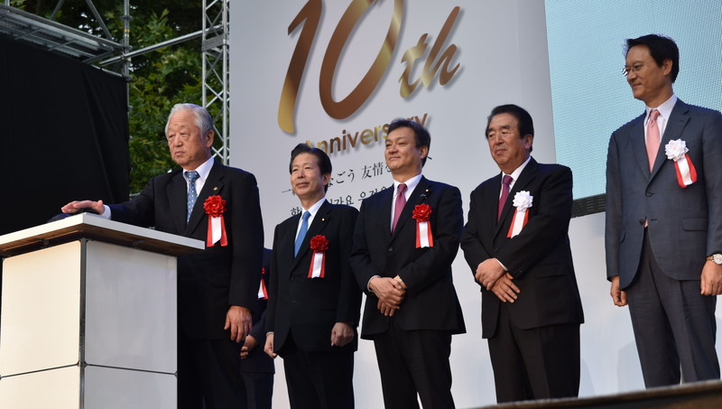 外務省の堀井巌大臣政務官、日韓議員連盟の額賀福志郎会長などの祝辞に続き、韓日を代表する人士として民団中央本部の呂健二団長、福田康夫元首相らが一人ずつスイッチを押すと、過去9回の大会ポスターが次々に大型ビジョンに映し出された。14人目の高円宮妃殿下のスイッチで過去と今年の大会スローガン「一緒につなごう友情を未来へ」がつながり、観客の喝さいを浴びた。