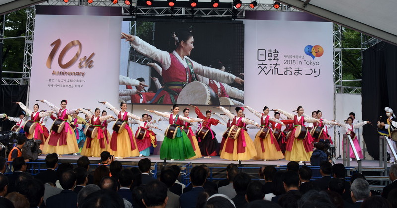 今年で10回目を迎えた韓日文化交流の祭典「韓日祝祭ハンマダン(日韓交流おまつり)2018inTokyo」が9月22、23日の両日、東京・日比谷公園で開かれ、約7万人の観客が訪れた(主催者発表)。日本側の佐々木幹夫、呉公太両実行委員長、韓国側の朴三求委員長が「09年に始まったこの行事は、両国関係が厳しい時期があっても一度も途絶えることなく、草の根の文化事業として定着した。今後も明るく穏やかな市民交流が続くことを心から願う」とあいさつした。