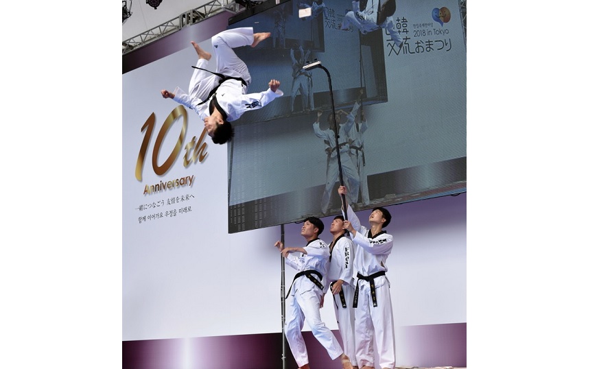 2部の日韓交流ステージは、韓国の第1軍野戦司令部テコンド演武団による高さ4㍍を超える「ジャンピング板割り」、国士館大学空手道部の空手演武で始まった。