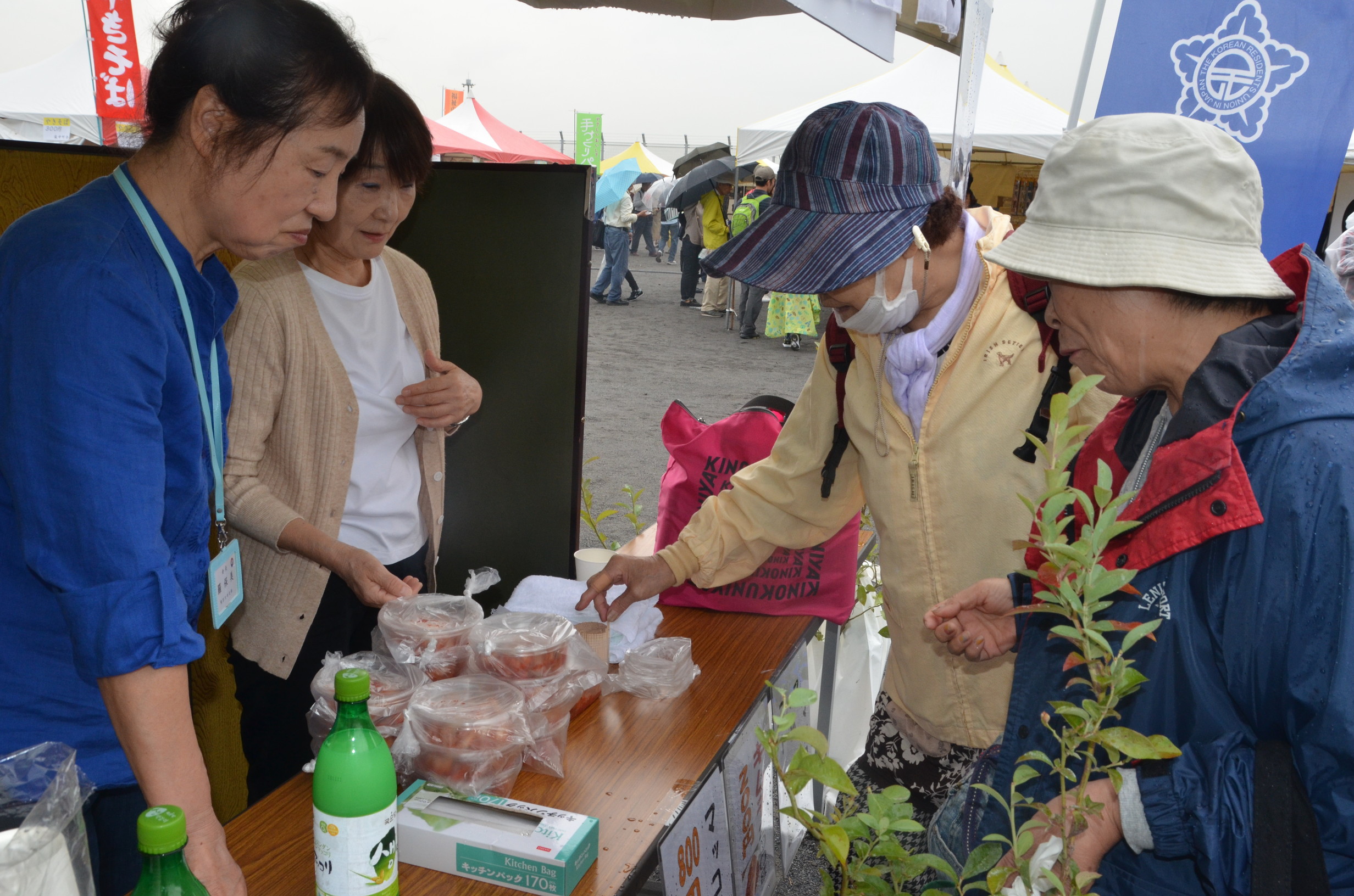 ブースでは婦人会支部の協力を得て白菜キムチの試食コーナーも設けた。来場者は「ものすごい辛いですか」と心配そうだったが、試食して味に納得すると買い求めていた。1袋200グラム入りで200円。李香眞事務部長によれば「韓国のPRが目的なので、もうけは考えていない」とのこと。