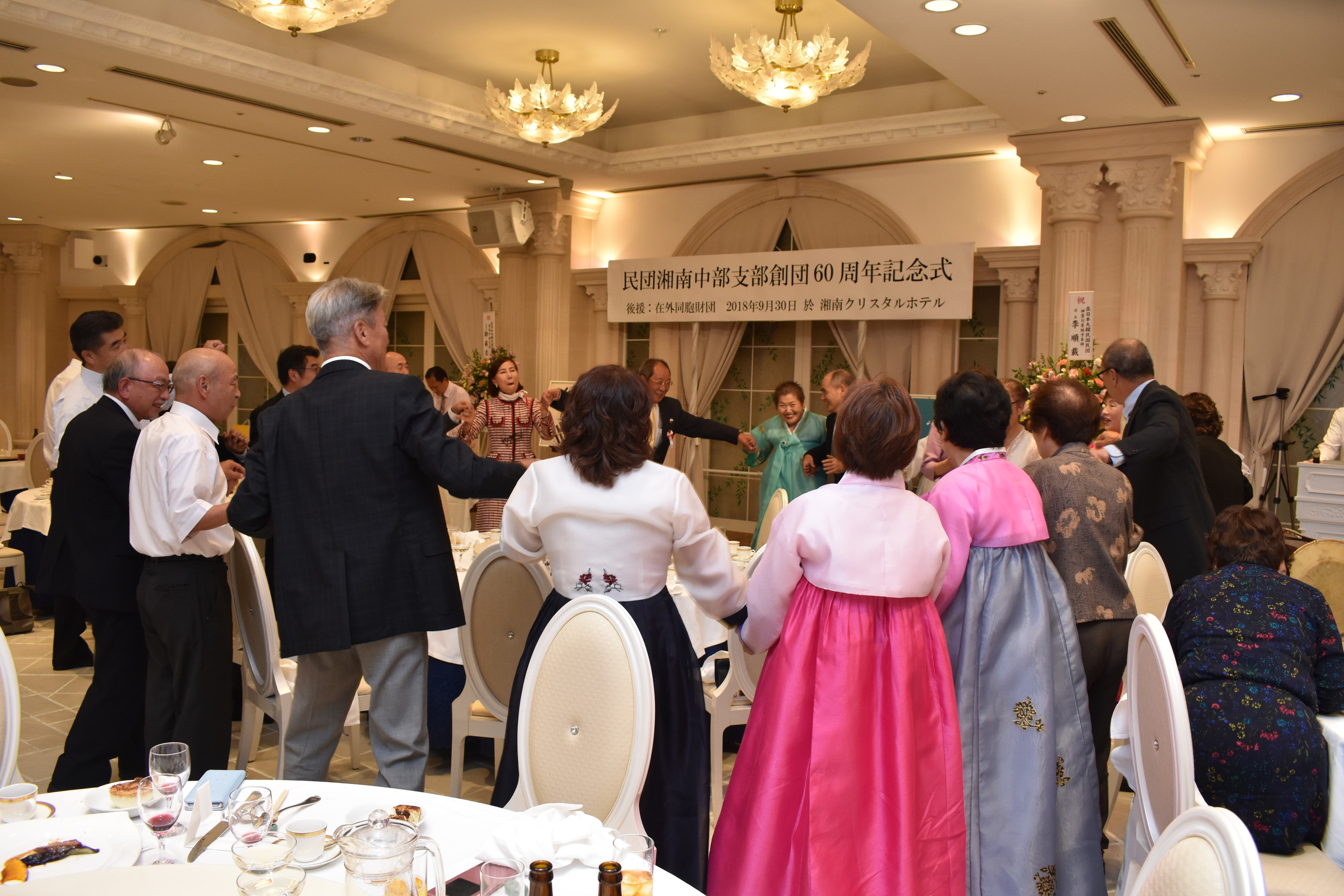 式典後の祝宴では、同支部の設立から現在までの歴史をスライドショーで振り返ったあと、婦人会によるコーラスやカラオケなどで盛り上がった。チャンゴの演奏が始まると皆が輪になって踊り、会場の雰囲気は最高潮に達した。記念式典に先立って行われた「長寿セミナー」では参加者に記念品が手渡さ