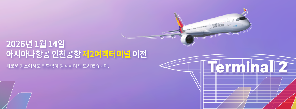 アシアナ航空は、2001年3月に仁川国際空港が開港してから第1ターミナルを使用してきたが、経営統合を控える大韓航空と同じ第2ターミナルに移転することになった。 第2旅客ターミナルでの搭乗手続きは3階東側のG~Jカウンターで受け付ける。