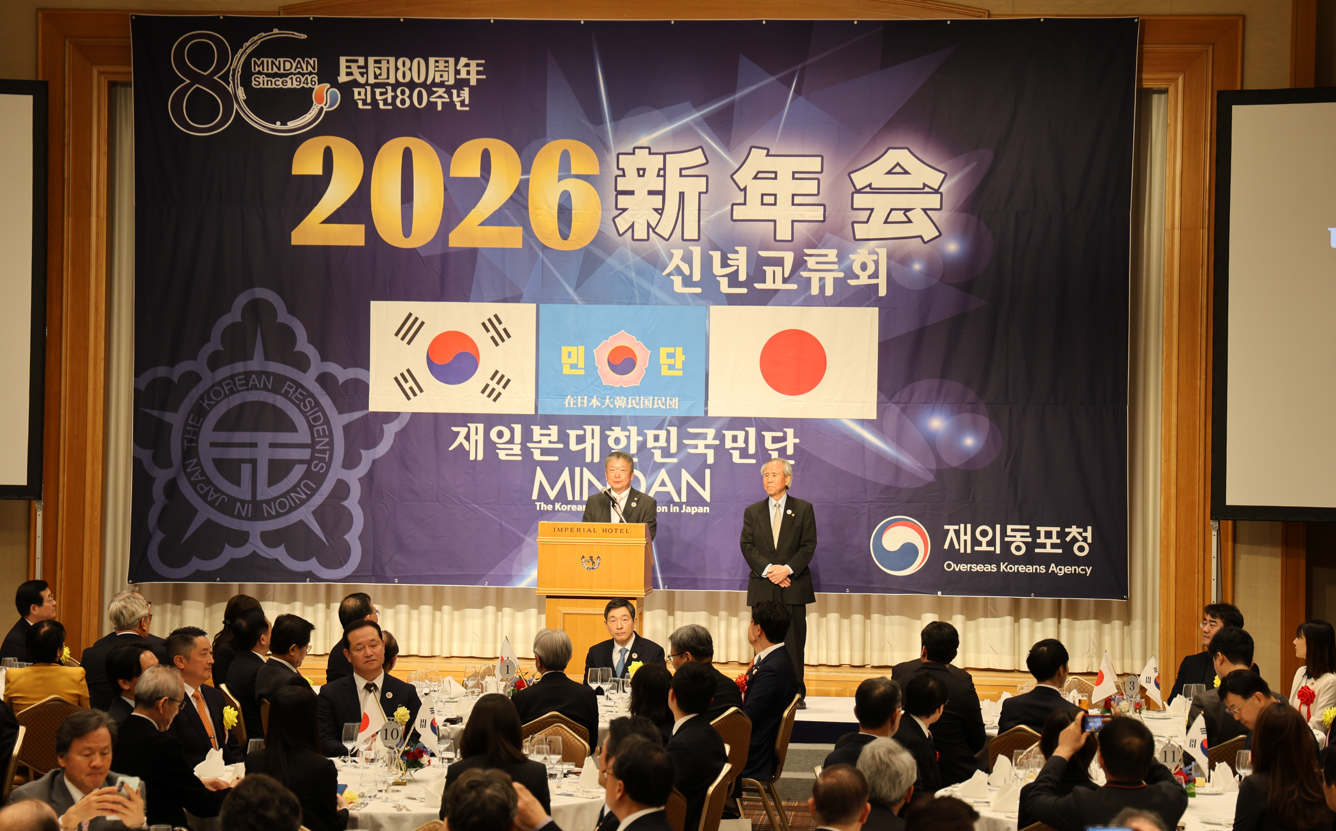 民団中央本部は1月9日、都内のホテルで2026年新年会を行った。韓日議員連盟、韓国外交統一委員会に所属する国会議員や韓日親善協会役員、日本側からも各政党代表、国会議員、諸団体から多くの来賓など約300名が参加した。