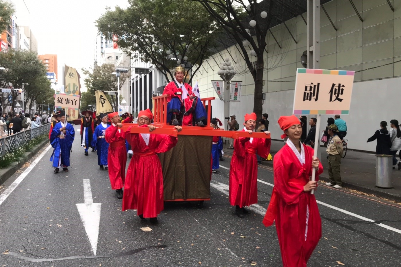 10月20日、まつりの初日にパレードの一角として登場した朝鮮通信使再現行列50名、先頭から斉藤会長扮する「雨森芳洲」、鄭総領事扮する「正使」、朴団長扮する「副使」が輿を連ねて、名古屋駅から矢場町まで約3キロの道のりを練り歩きました。