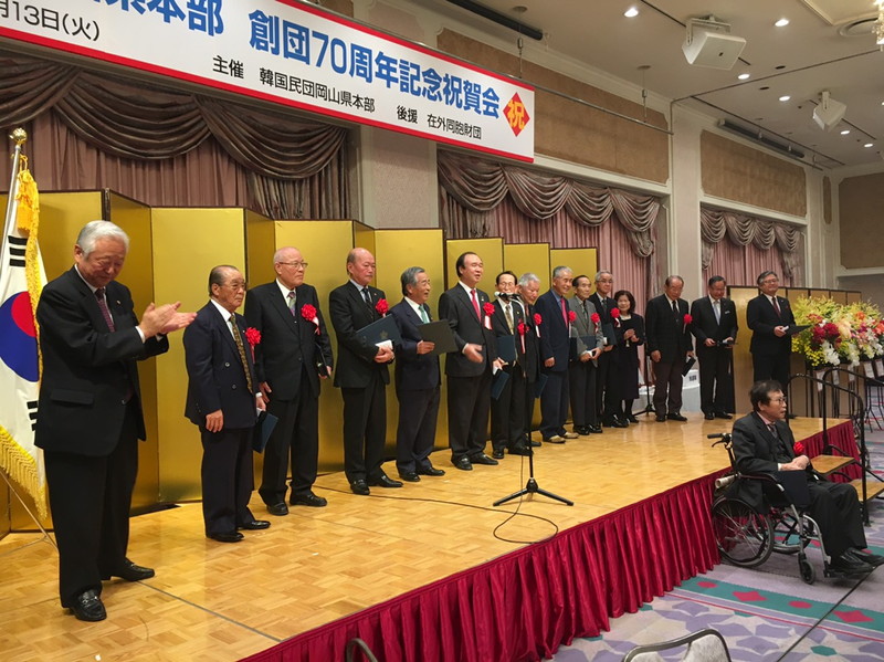 【岡山】民団岡山本部(金成植団長)は13日、岡山市内のホテルで創団70周年記念式典を開催した。民団中央本部から呂健二団長、韓賢澤副議長、駐神戸総領事館から朴起準総領事、来賓として伊原木隆太岡山県知事、大森雅夫岡山市長、田原隆雄備前市長らが出席した。同本部と支部の役員・団員をはじめ、近県の広島、山口、香川本部の役員、県議や市議を含め185人が祝った。