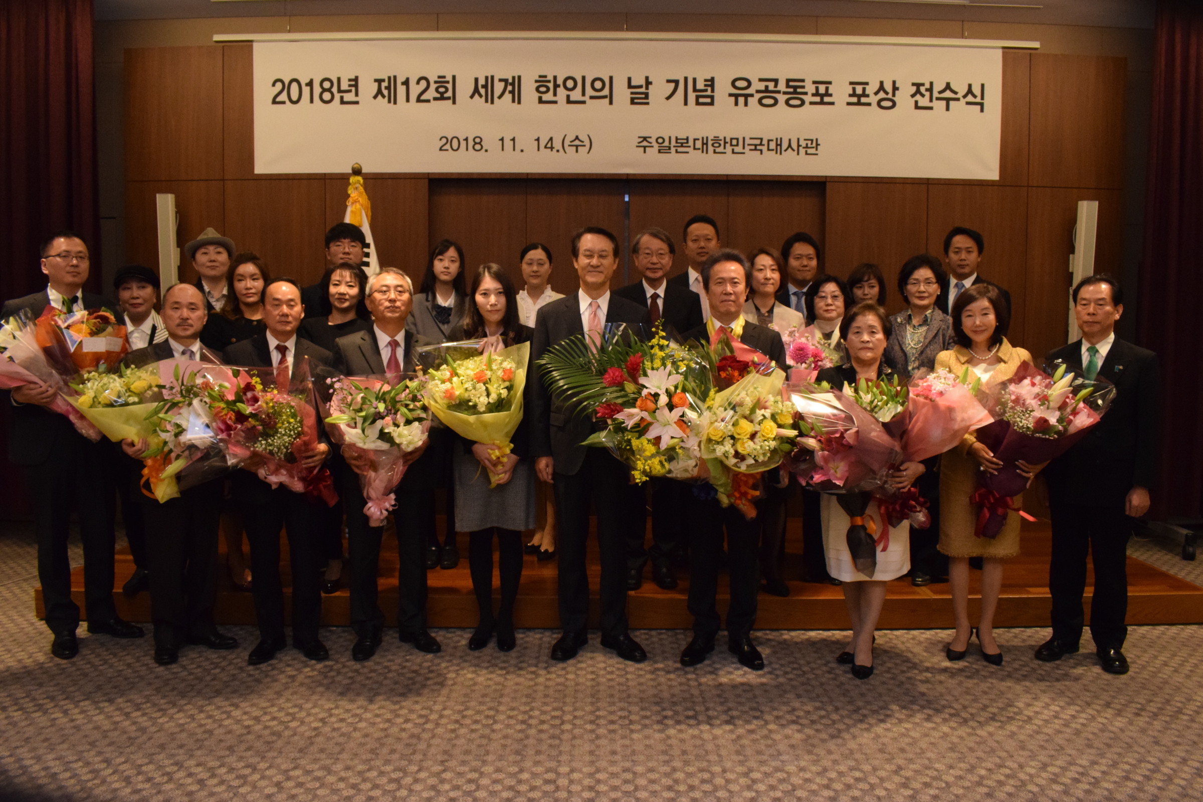 第12回世界韓人の日を記念する有功同胞褒章伝授式が14日、東京・南麻布の駐日大使館で行われ、受章者 8人に李洙勲駐日大使から政府褒章が伝授された。