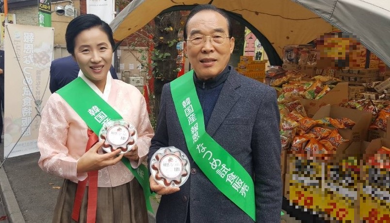 [ 生ナツメが販売されている東京・新大久保で直々に広報を行う趙善玉料理研究院院長と鄭相赫郡守(右) ]