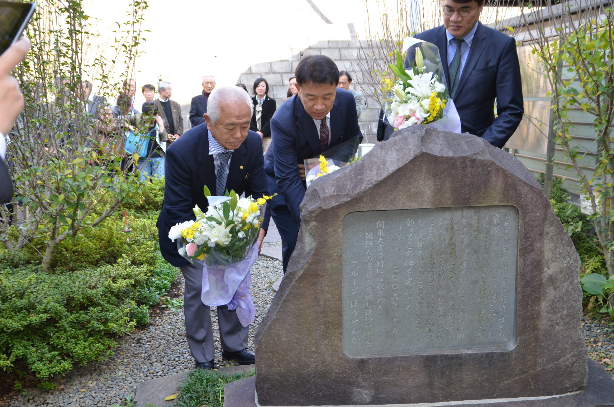 [ 荒川土手下に建つ関東大震災時韓国・朝鮮人殉難者追悼之碑に献花する左から金秀吉団長、兪皓善院長、李讃範総領事 ]
