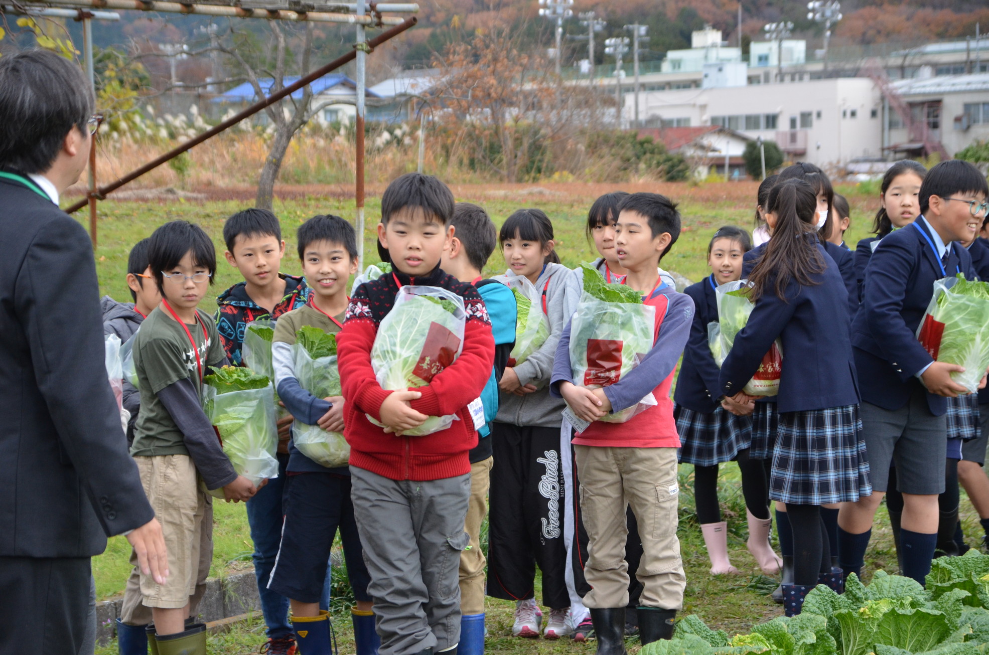 栽培を請け負った高麗高齢者農業生産集団の斉藤篤さんによれば今年は「生育がすごくいい」とのこと。味のよさは虫が多かったことでも分かる。ずぐりむっくり、日本の白菜より短く丸みを帯びているのが特徴だ。子どもたちも「ウワーデカ!重い」と驚いたほど。