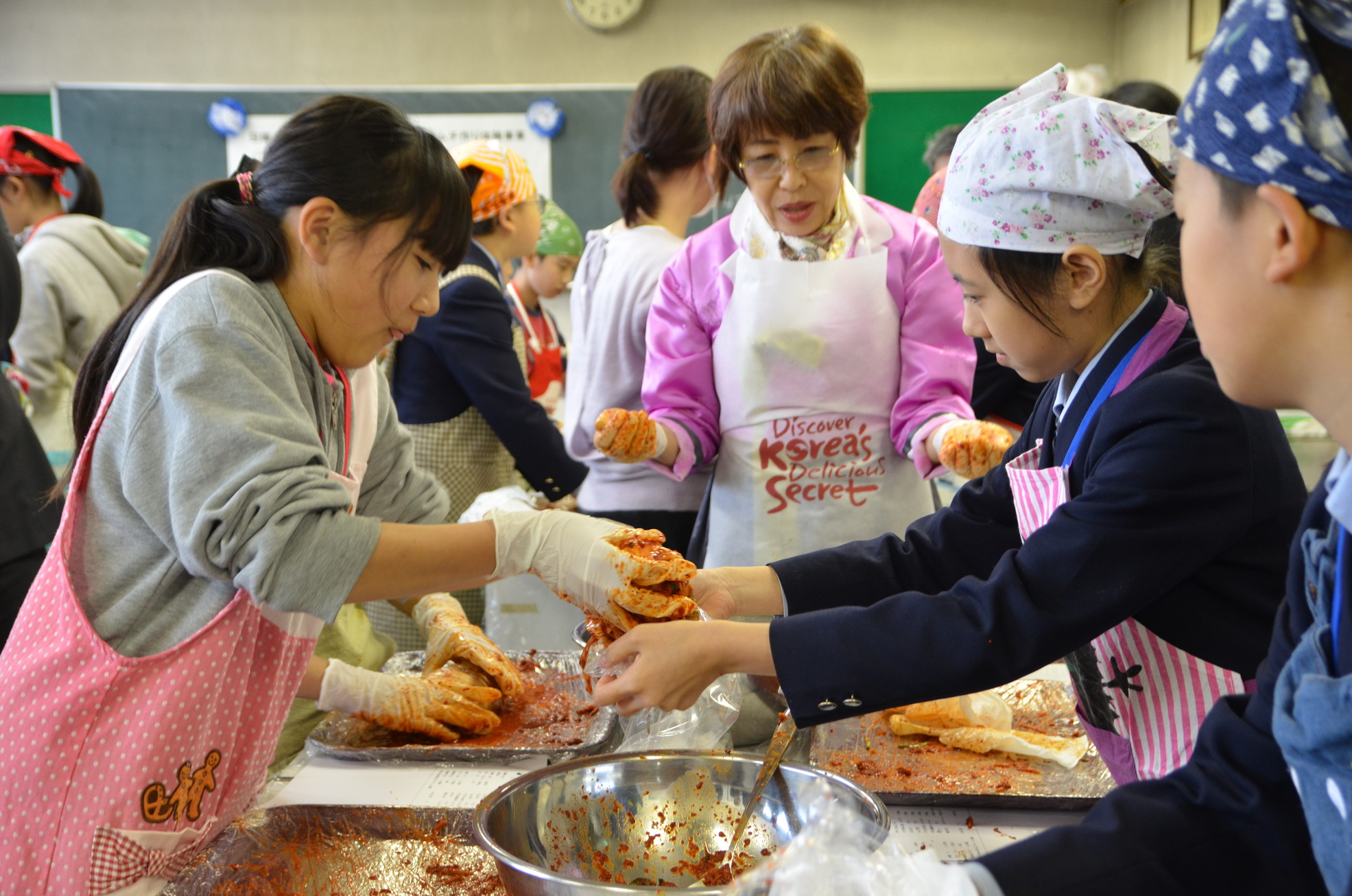 収穫を終えると近くの日高市高麗公民館調理室に移り、4つのテーブルに別れて「キムチソムリエ」の称号を持つ柳香姫さんの指導のもと一緒になってキムチづくりを体験した。新宿韓国商人連合会の呉会長は「白菜の種は韓国からやってきたが、ここ高麗の土で育まれて美味しくそだった。皆さんもこの白菜のように仲良くしてください」と声をかけた。日高市からは谷ケ﨑市長自ら激励に訪れた。