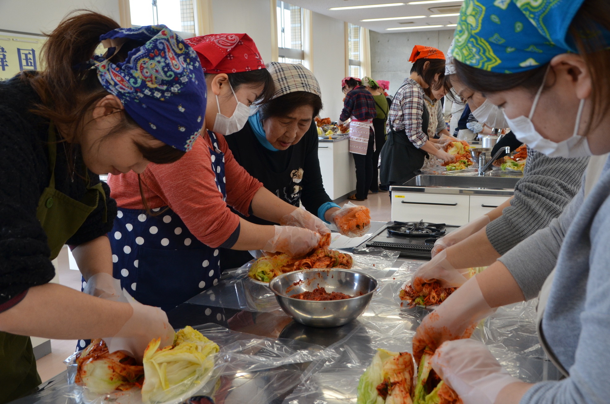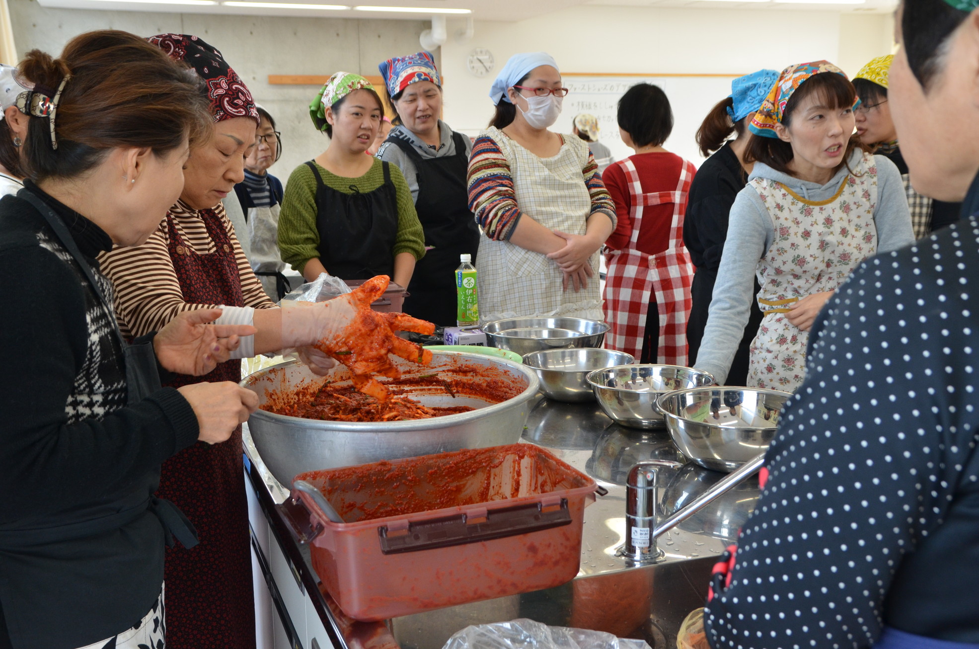 講師は同中央支部会員の白再粉さんが白菜キムチの漬け方を担当。補佐した婦人会本部の役員も5つのテーブルに分かれ、参加者からの質問に応えた。民団茨城本部の文京順事務副局長は「これはただの料理講習ではない。料理を通じた草の根の韓日文化交流が本来の目的だ」と強調した。