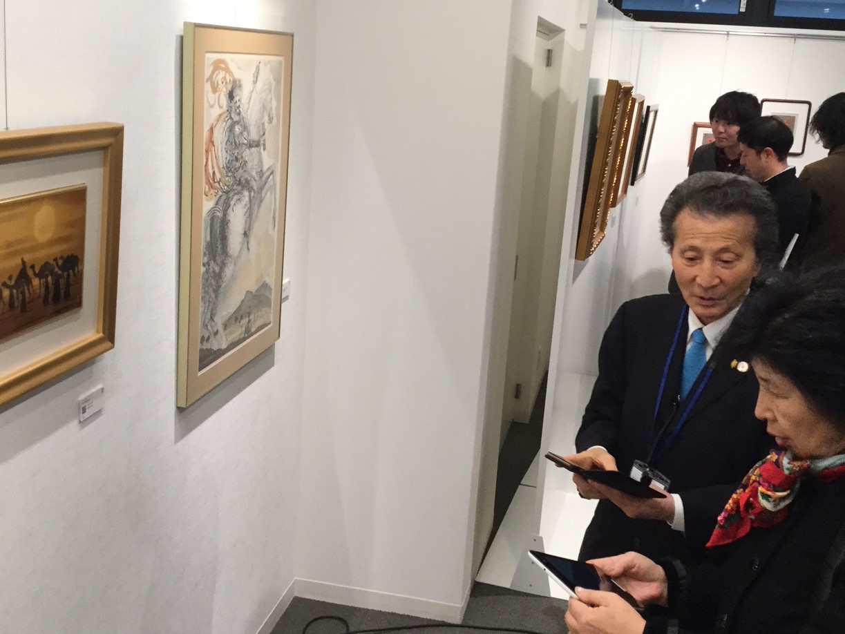 美術館はビルの1、2階延べ約330平方㍍。ここには2000点にのぼる絵画や陶芸、書、工芸品などのコレクションのうちすでに整理・登録を終えた約200点を常設展示している。各作品にはQRコードが添えられており、スマホアプリで読み込むと、その作者や作品についての様々な情報を7カ国語で読み取ることができる。