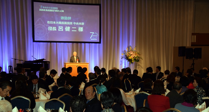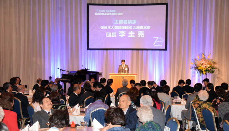 【北海道】民団北海道本部(李圭亮団長)の創立70周年記念式典が26日、札幌市内のホテルで開催された。民団中央本部から呂健二団長、朴安淳議長、李根茁、任泰洙、金利中副団長、駐札幌総領事館から朴賢圭総領事、来賓として辻泰弘北海道副知事、吉岡亨札幌副市長、上野八郎・北海道日韓親善協会会長をはじめ、地元選出の衆参議員と道議員ら多数が出席した。