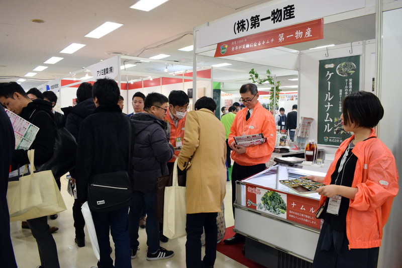 関連業者203社が出展。キムチやチャンジャなどの総菜を扱う業者が目立つ中で、第一物産は、栄養価が高いことから「野菜の王様」と呼ばれるケールのナムルを新商品の目玉として紹介した。