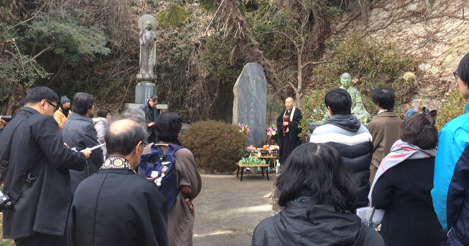 [ 慰霊碑を前に姜栄熹住持の法話に耳を傾ける参加者たち(宝徳寺) ]