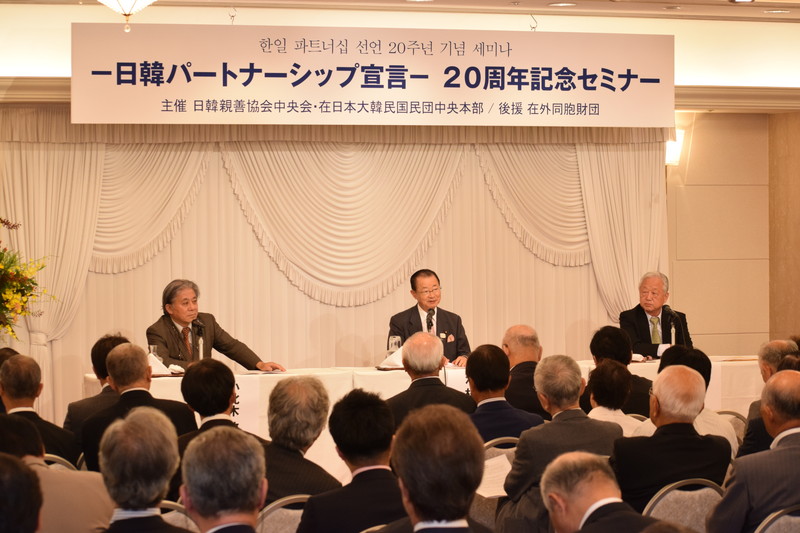 金大中大統領と小渕恵三首相による「21世紀に向けた新たな韓日パートナーシップ宣言」から20年を迎え、日韓親善協会中央会と民団中央本部は在外同胞財団の後援を受け、都内で「韓日パートナーシップ宣言・20周年記念セミナー」を共催した。