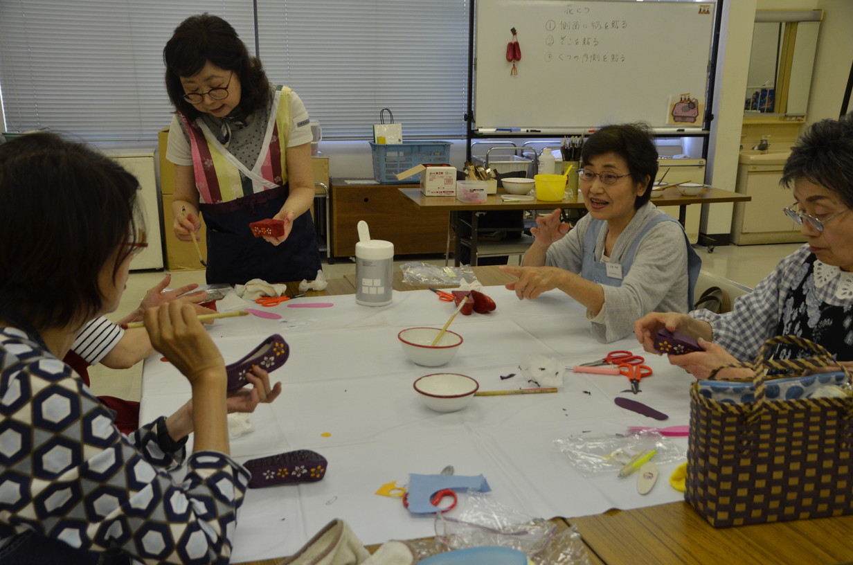 24日の課題は「花コムシン」。講座担当者の「韓国っぽいものがいい」との提案を受け、講座の講師で、上級免状を持つ高橋惠子さんが韓国からキットを仕入れた。基本は台となる靴の側面と底、靴の内側にガラを貼るだけの作業だが、カーブがあるためにどうしてもしわになりやすく、難易度は高め。約2時間、ほとんどおしゃべりもなく、作業に没頭していた。