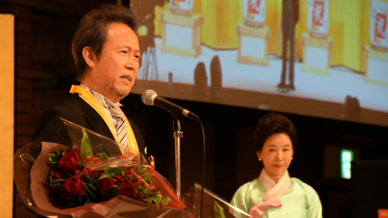 [ 「これからも同胞社会と韓日友好に努力したい」と謝辞を述べる金光一氏 ]