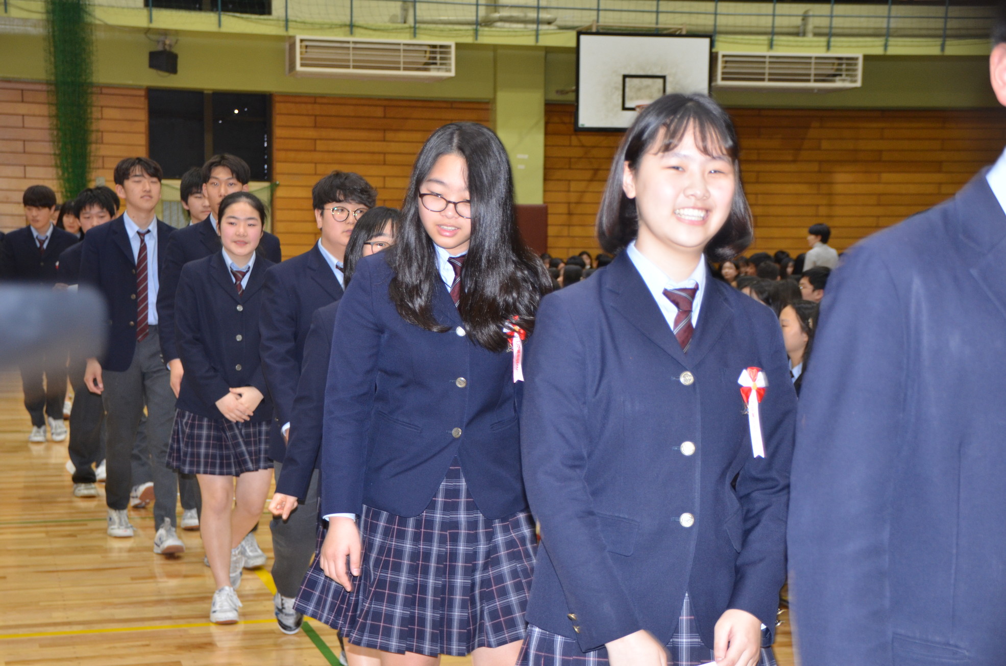 李校長は「生徒たちには何事も成し遂げられる力がある。その力を信じて頑張ってほしい」と呼びかけた。駐大阪総領事館の梁鎬錫教育官、民団大阪本部の呉景萬民族教育推進委員長、韓国大阪青年会議所の金亨南会長らが見守った。