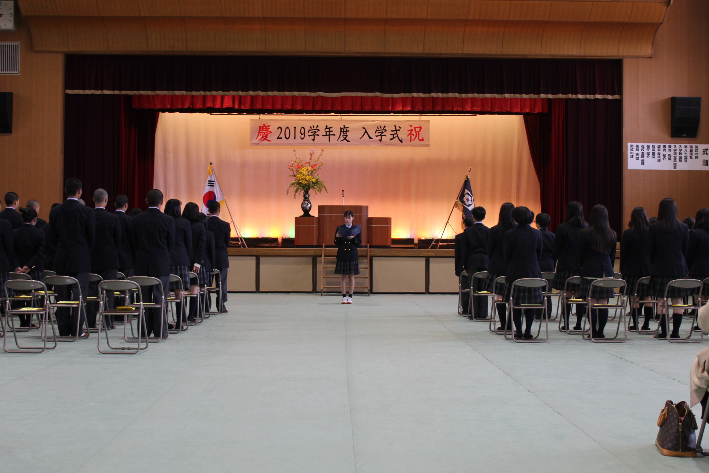 尹校長が入学許可を宣言。岩城陽子副理事長が激励の辞を述べた。小学6年生代表の鄭西玹君が「金剛ファミリーとして共に学び、共に助け合いましょう」と歓迎した。