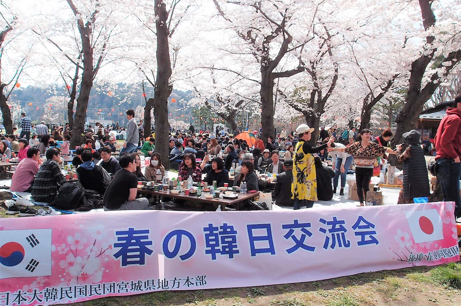 【宮城】民団宮城本部(金政郁団長)は14日、桜が満開となった仙台市青葉区の西公園で「春の韓日交流会」を開催した。天候にも恵まれ、団員と韓国語講座の受講生ら100人余りが参加。韓国の音楽が流れるなか、キムパ弁当と海鮮スンドゥプチゲ、キムチの食事を楽しんだ。