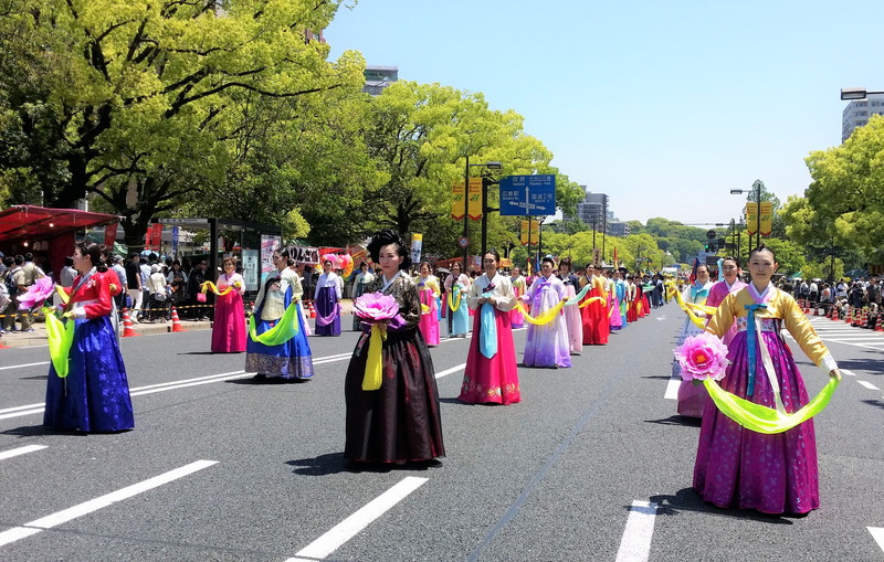 パレードは鄭愼二さんが自ら指導してきたサムルノリチームを率いた。韓国から来日したプロ奏者の孫周絃氏も加わり、力強い演奏を披露した。その後を韓服姿のオリニと女性たちが華麗な舞で続いた。サムルノリと韓服の調和のとれた伝統美には沿道から「きれい」と歓声があがった。振り付けは今年も広島韓国芸術院の朴裕恵さんが担当した。