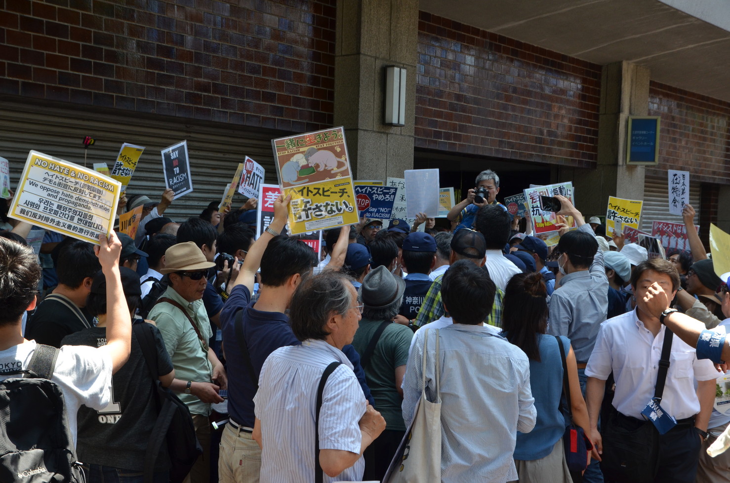 抗議行動を呼び掛けてきた市民団体「ヘイトスピーチを許さない市民ネットワーク」はあらかじめプラカードを用意していたが、独自に用意した市民も多かった。