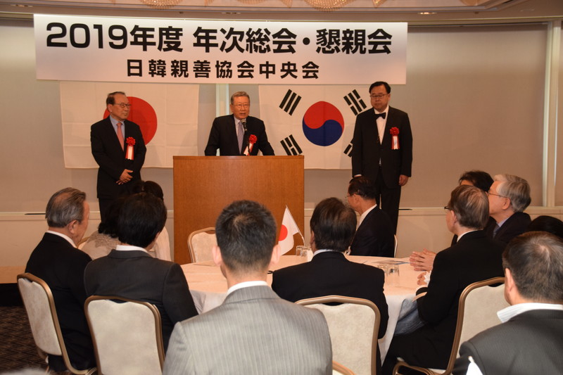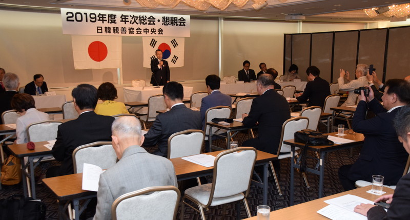 日韓親善協会中央会(河村建夫会長)は24日、2019年度年次総会・懇親会を都内のホテルで開催した。総会には役員と理事ら約50人が参席した。