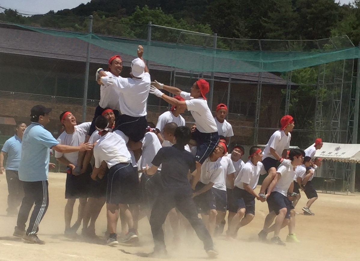 男子高校生による騎馬戦では赤、白の各8チームに分かれて運動場を走り回り、相手方の帽子を取り合った。保護者席からは声援が飛んだ。大縄跳びや綱引きでは、婦人会京都本部の金和子会長をはじめとする役員ら25人が「頑張れ」と大声で応援した。