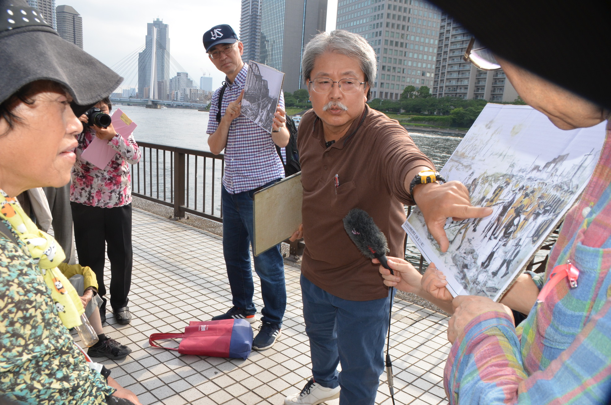 ここでは32人を連行し、川に飛び込んだ17人を実弾17発で殺したとされる。実際は処刑したようだ。残りは殴り殺された。童画家・河目悌二が自ら目撃して描いたとされるスケッチは国立歴史民俗博物に残されている。隅田川を前に参加者全員で追悼の「アリラン」を斉唱した。
