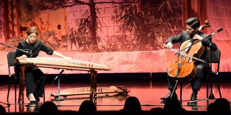 公演は豪州出身のチェリスト、金ソルダニエルさんと韓国出身のカヤグム奏者、尹茶暎さんによるコラボ「チェロカヤグム」の演奏で幕を開けた。