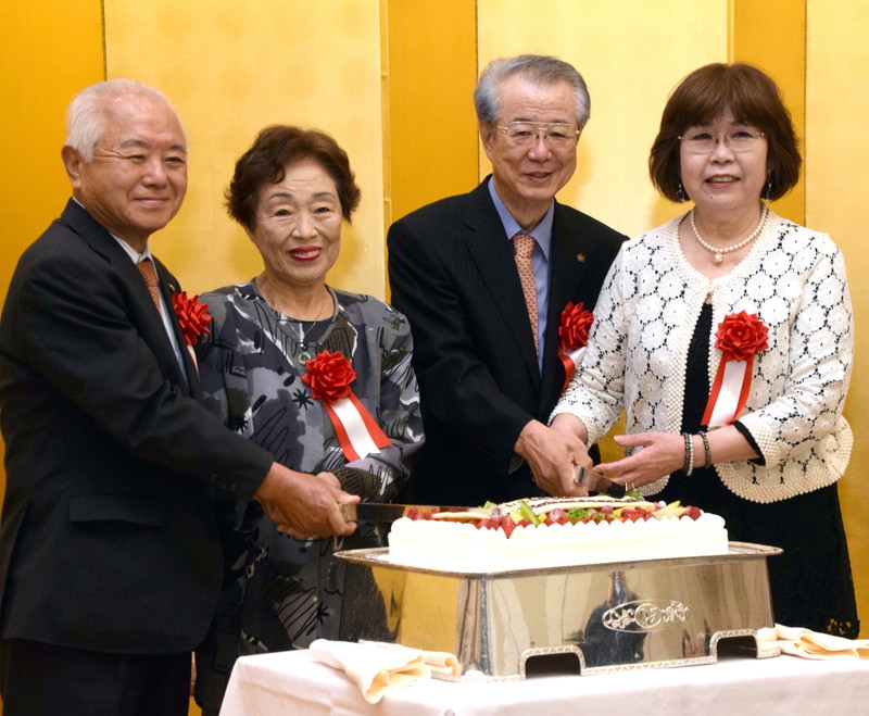 [ 夫人と一緒にケーキに入刀する金秀吉氏と秦富澤氏 ]